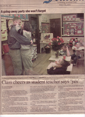 I snagged the ring from the sock drawer, and picked up the prettiest flowers I have ever seen, and made my way down to Sioux City that afternoon. When I showed up, the teacher found me in the hall and said “I hope you don’t mind, but I called the paper and they came to do a story.”
